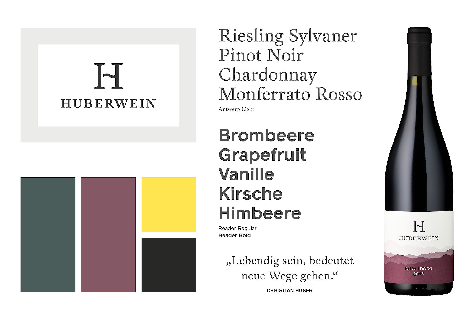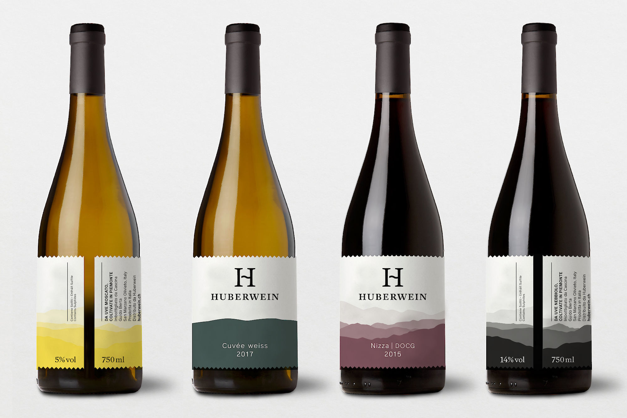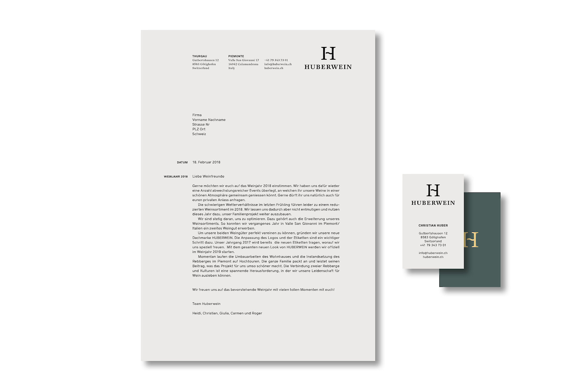 A new brand identity and a new name for a Swiss winery. The approach is to visually combine the wine-growing regions of Thurgau in eastern Switzerland and the famous wine region of Piemont in Italy. The brand conveys the idea of a fresh logo and visual identity worthy of a modern, premium product. The letter H has the quality of representing two wineries in one logo.